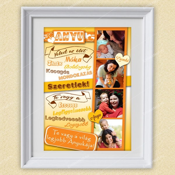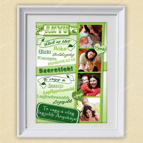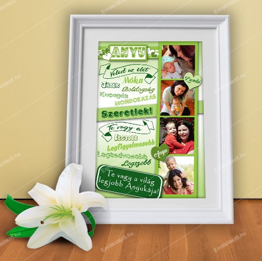 Emlékidéző Képünk álló tájolással több színben (barna, bíbor, korall, sárga és zöld) is elérhető. A kép magában foglalja az általad megadott 9 szóból álló üzeneten felül, hogy milyen fontos számodra az ajándékozott, valamint a gyermek keresztnevét, illetve négy a gyermek(ek)et, vagy az Anyával közös képet ábrázoló fényképet.