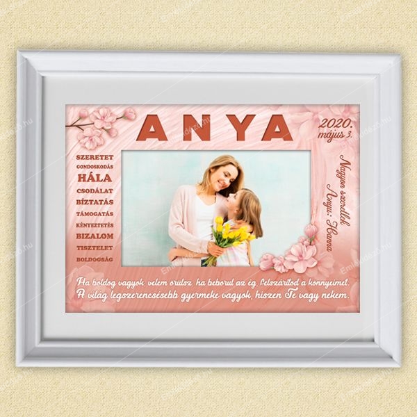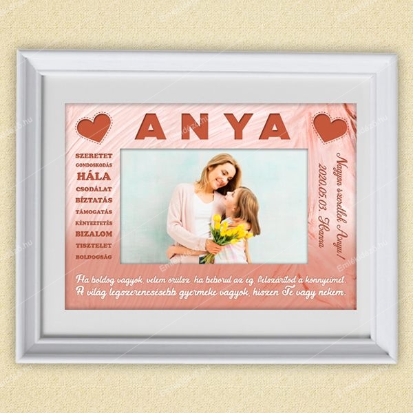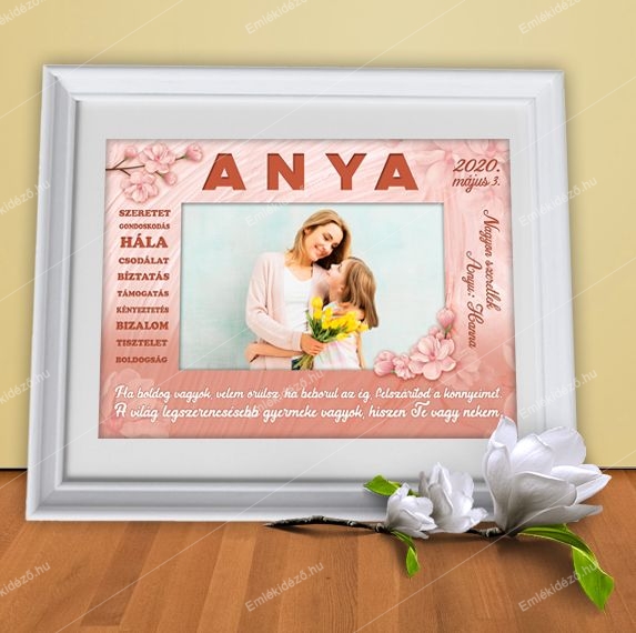 Emlékidéző Képünk fekvő tájolással készült két mintával (szív és virág). A kép magában foglalja azt az általad megadott 10 szót, illetve az alsó hosszabb szöveget, mely kifejezi, hogy mit jelent számodra Anyukád, illetve egy rövid köszöntő üzenetet, az ajándékozó(k) keresztnevét, a dátumot, valamint egy rólatok készült közös képet.