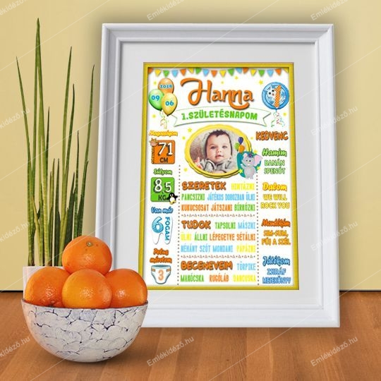 Emlékidéző Képünk álló tájolással fiús és lányos változatban is elérhető. A kép magában foglalja a gyermek keresztnevét, aktuális születésnapjának dátumát, a súlyát, magasságát, a fogacskáinak a számát és a pelenka méretét, a kedvenc ételét, dalát, mondókáját és játékát, valamint felsorolás jelleggel, hogy mit tud már és mit szeret igazán, illetve a beceneveit. Ezen kívül az őt ábrázoló fényképet is.