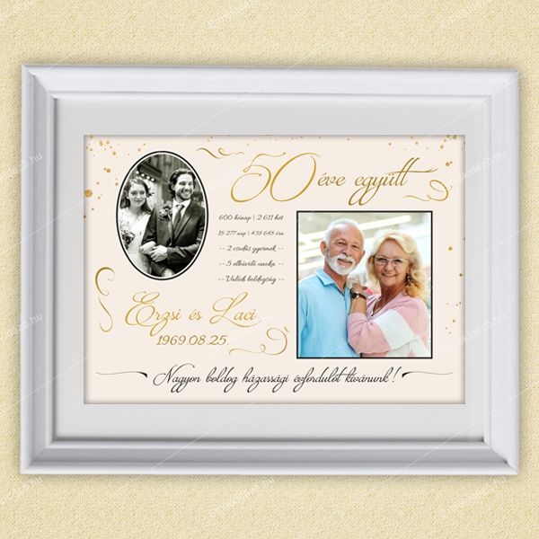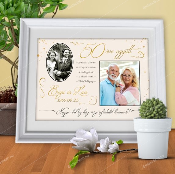Emlékidéző Képünk fekvő tájolással készült. A kép magában foglalja a házasság éveinek számát, a házaspár nevét, az esküvő dátumát, az eddig eltelt időt, a gyermekek, unokák számát, illetve az esküvői, valamint egy frissebb közös képet.