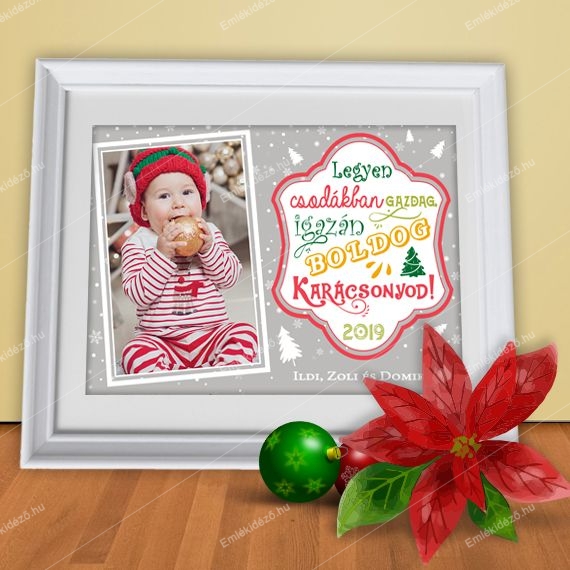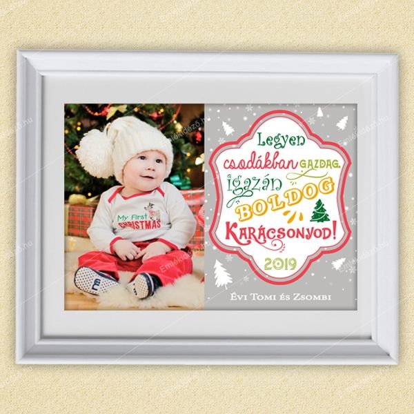 Emlékidéző Képünk fekvő tájolással készül két variációban. A kép magában foglalja a Karácsonyi jókívánságon felül a gyermek vagy a család közös fényképét és ajándékozók keresztnevét, valamint az évszámot.