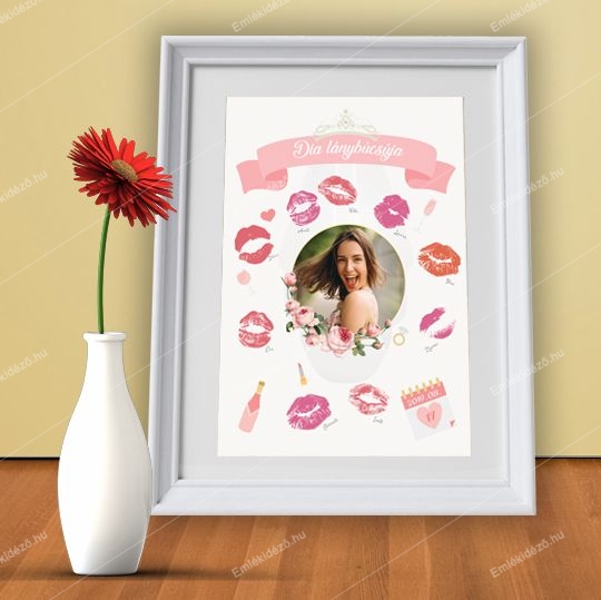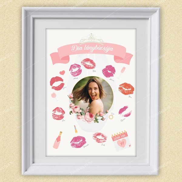 A Lánybúcsú különleges ajándéka lehet ez a csodás Emlékidéző Kép, mely a menyasszony legközelebbi barátnői rúzsnyomát tartalmazza egy igazán kreatív formában.