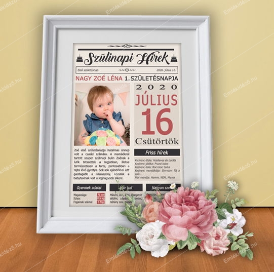 Emlékidéző Képünk álló tájolásban készül. A kép magában foglalja az általad megadott szövegekből álló üzeneten felül, a gyermek nevét, aktuális születésnapjának dátumát, a súlyát, magasságát, és a fogacskáinak számát, a kedvenc ételét, mondókáját, dalát és játékát, valamint felsorolás jelleggel, hogy mit tud már, mit mond már és mit szeret igazán.
