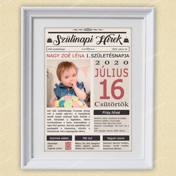 Mondd el nekünk, hogy milyen volt az első szülinapi ünneplés, illetve azt ,hogy gyermeked milyen nagyot fejlődött 1 éves korára, miket tud és miket szeret a legjobban, hogy mik a kedvencei és mi elkészítjük egyedi és igazán különlegese szülinapi baba poszterét.